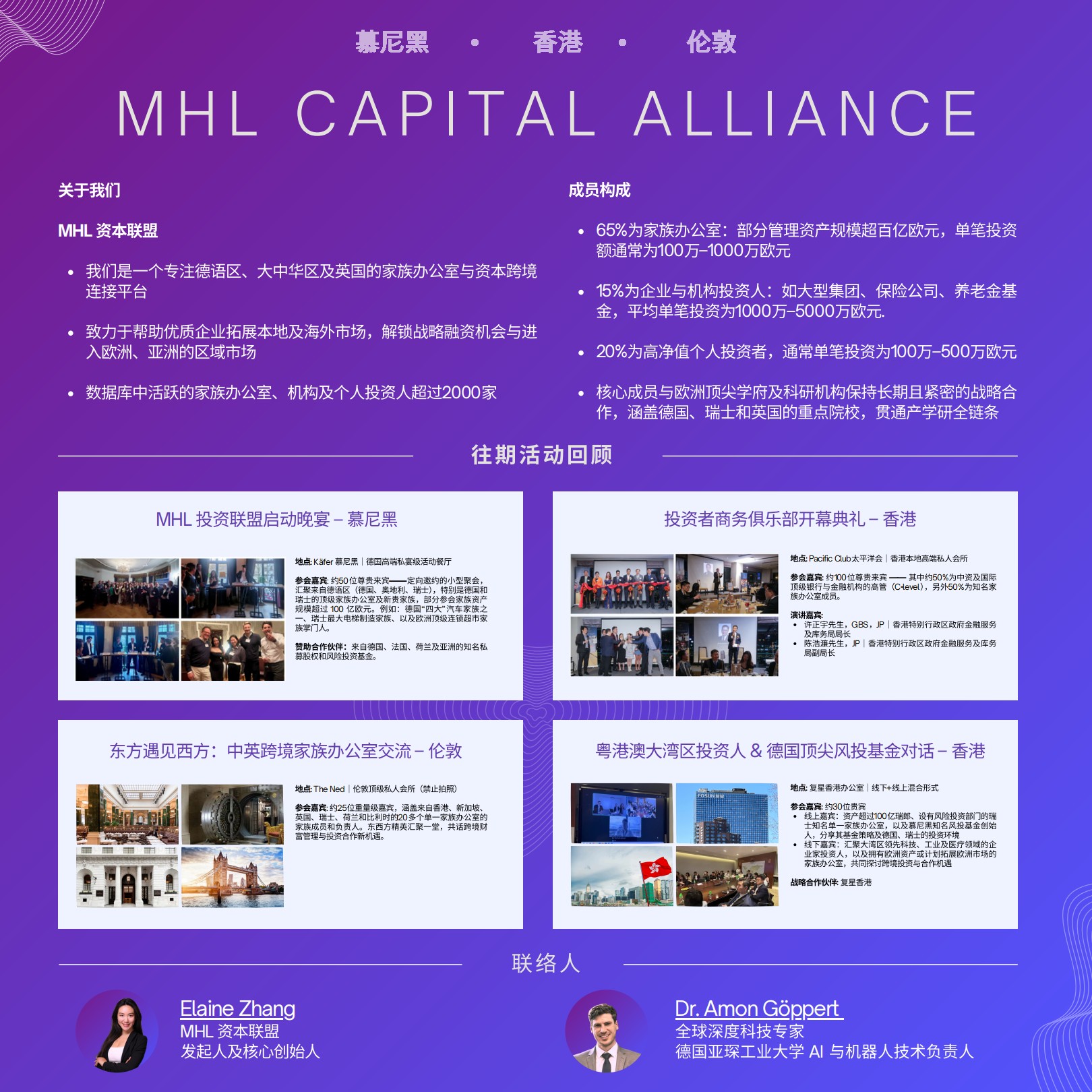 MHL資本聯(lián)盟是由歐洲與亞洲多家知名家族辦公室共同發(fā)起的跨境資本與資源平臺(tái),聚焦于德語(yǔ)區(qū)、英國(guó)以及大中華區(qū)市場(chǎng)。其致力于幫助優(yōu)質(zhì)企業(yè)拓展本地及海外市場(chǎng),為企業(yè)解鎖戰(zhàn)略融資機(jī)會(huì),并助力企業(yè)進(jìn)入歐洲、亞洲的區(qū)域市場(chǎng)。
