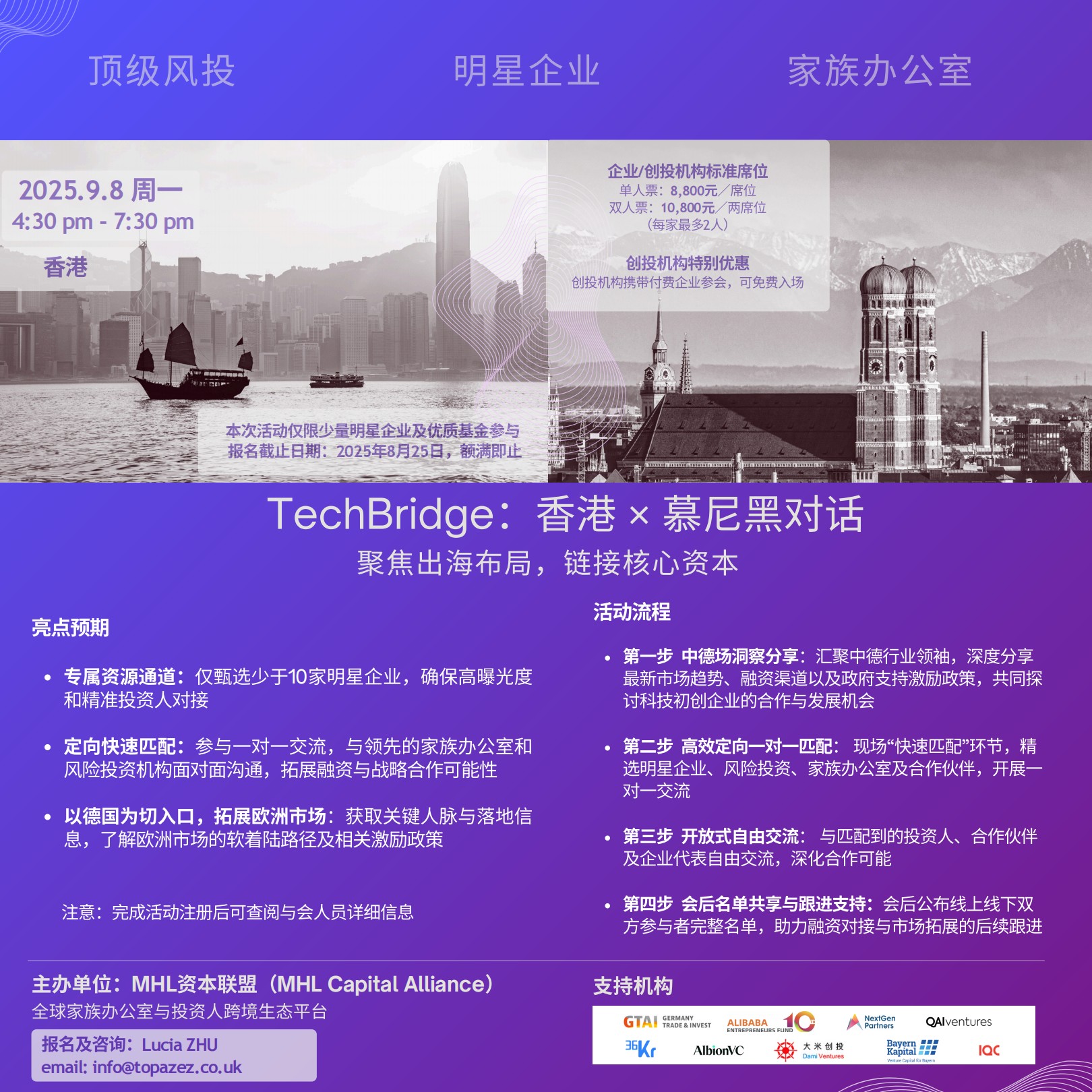 2025年9月8日,TechBridge:香港 × 慕尼黑科技投融資對(duì)接會(huì)將盛大舉行。此次對(duì)接會(huì)將在一天的時(shí)間里,為少于10家精心挑選的明星企業(yè),打開(kāi)通往中德核心資本的大門(mén)。