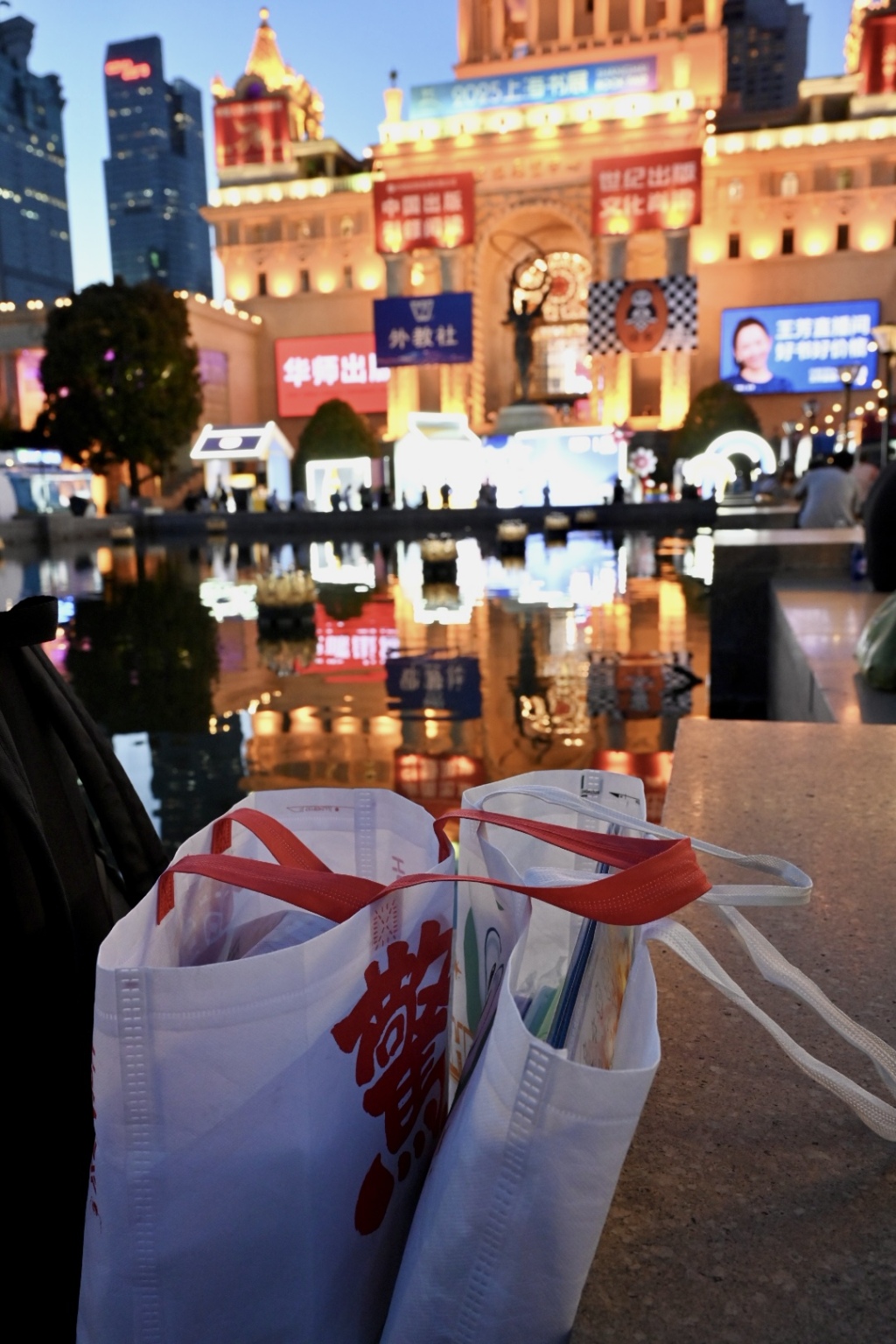 噴水池廣場邊,袋子里裝滿了書。澎湃新聞記者 吳棟 圖