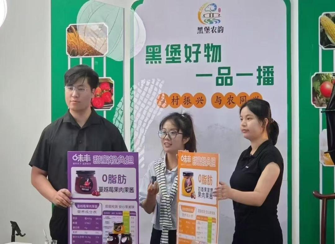 “我姓黑,黑堡的黑,周一周五等你歸,助農(nóng)增收帶你飛,鄉(xiāng)村振興永相隨……今天為大家?guī)砭奶暨x的——味豐果醬!藍莓果醬里全是整顆大果粒,富含花青素,而且零脂肪……”8月12日,在黑堡鄉(xiāng)“黑堡農(nóng)韻”抖音直播間,主播們活力四射的講解開啟了首場直播的大幕。
