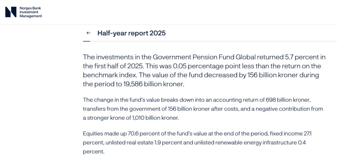挪威主權(quán)財富基金周二發(fā)布的報告顯示,今年上半年獲利6980億挪威克朗(約合682.8億美元),整體投資回報率為5.7%,略低于基準指數(shù)。