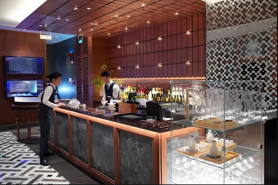 走進(jìn)漢威大廈左側(cè)的‘海底撈·臻選店’,場(chǎng)景與市場(chǎng)和消費(fèi)者熟悉的那片‘紅?!厝徊煌喊闹摭埼r在海鮮池游弋,西班牙5J火腿靜待品味,侍酒師與茶藝師隱于角落。