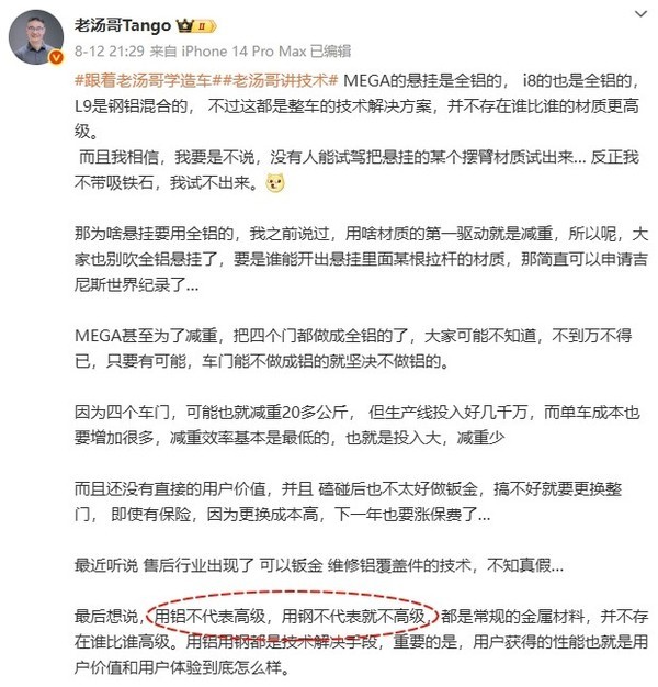 近日,理想汽車產(chǎn)品線負(fù)責(zé)人湯靖在社交平臺(tái)再次回應(yīng)了汽車行業(yè)的“鋼鋁之爭(zhēng)”。他強(qiáng)調(diào),鋁材和鋼材都是常規(guī)的金屬材料,選擇哪種材料取決于技術(shù)需求,而非所謂的“高級(jí)與否”。CNMO注意到,湯靖以理想MEGA車型為例,詳細(xì)說(shuō)明了材料背后的工程邏輯。