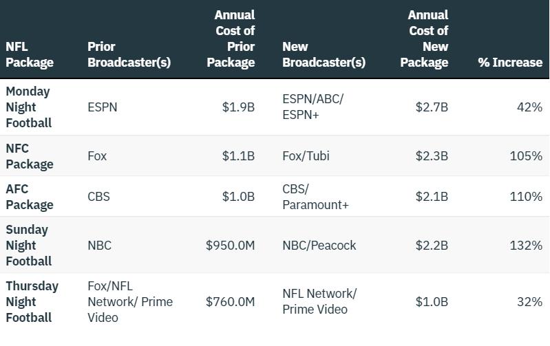 另一方面,頂級體育版權(quán)價格飆升,以NFL為例,2021年簽下11年1100億美元版權(quán)合同,ESPN每年要付27億美元。