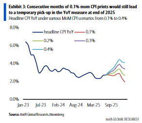 美銀測(cè)算顯示,基于基數(shù)效應(yīng),即便今年剩余時(shí)間月度CPI環(huán)比增幅維持在0.1%的溫和水平,2025年底同比CPI仍會(huì)回升至2.9%左右,較上半年明顯反彈。