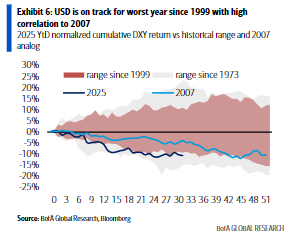 報(bào)告分析指出,2025年迄今,美元走勢(shì)與歷史對(duì)比,和2007年相關(guān)性最高,今年美元有望錄得1999年以來最大年度跌幅。