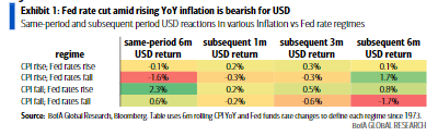 美銀指出,這種“通脹上行、利率下行”的組合十分罕見。自1973年以來,美聯(lián)儲(chǔ)在通脹上升時(shí)降息的概率僅為16%。