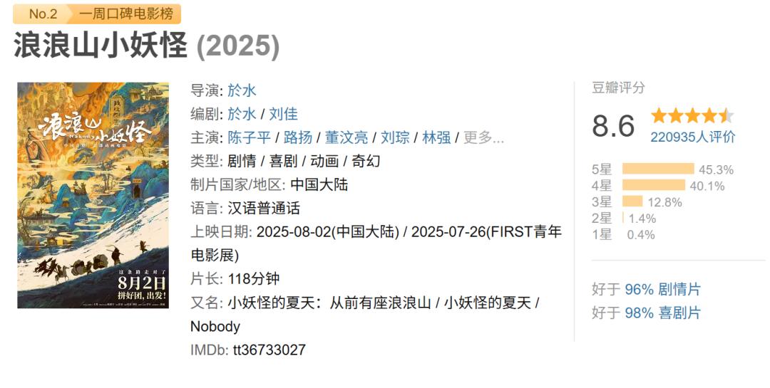 這部由上美影出品的作品,憑借獨(dú)特的二維水墨畫風(fēng)和新穎的敘事視角,在2025年暑期檔創(chuàng)造了票房佳績(jī)。截至目前,《浪浪山小妖怪》豆瓣評(píng)分8.6分,票房已破6億,據(jù)貓眼電影最新預(yù)測(cè),最終票房預(yù)計(jì)達(dá)15.34億元。