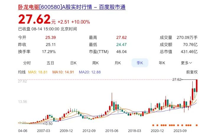 二級(jí)市場(chǎng)率先對(duì)此做出反應(yīng)。截至8月14日收盤,臥龍電驅(qū)股價(jià)為27.62元/股,直接漲停,創(chuàng)下股價(jià)歷史新高。該股價(jià)較2024年12月31日14.21元/股的收盤價(jià)上漲近94%,當(dāng)前市值為431.46億元。這意味著,今年以來,臥龍電驅(qū)市值已“擴(kuò)容”了近209億元。