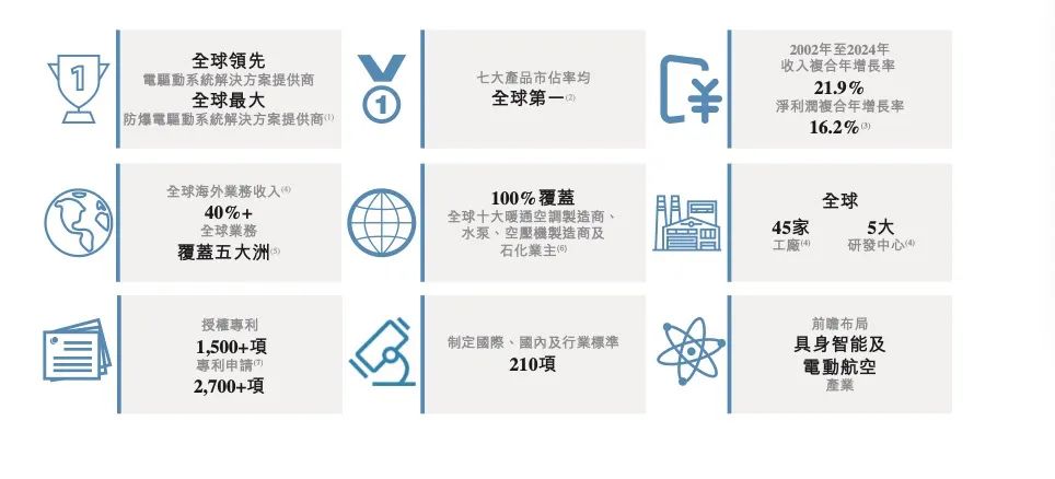 根據(jù)弗若斯特沙利文的資料,按2024年收入計(jì),臥龍電驅(qū)在全球防爆電驅(qū)動(dòng)系統(tǒng)解決方案市場(chǎng)排名第一,市場(chǎng)份額約為4.5%;在全球工業(yè)電驅(qū)動(dòng)系統(tǒng)解決方案市場(chǎng)排名第四,市場(chǎng)份額約為2.8%;在全球暖通電驅(qū)動(dòng)系統(tǒng)解決方案市場(chǎng)排名第五,市場(chǎng)份額約為2.0%。