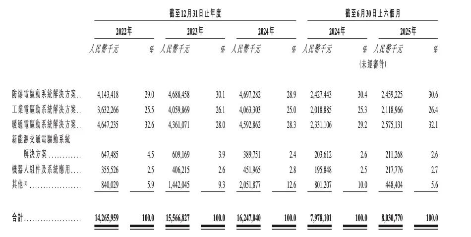 其中,防爆、工業(yè)及暖通電驅(qū)動(dòng)系統(tǒng)解決方案是公司基礎(chǔ)業(yè)務(wù)板塊,報(bào)告期內(nèi)三大業(yè)務(wù)板塊收入占比高達(dá)87.1%、84.2%和82.2%。新能源交通電驅(qū)動(dòng)系統(tǒng)解決方案以及機(jī)器人組件及系統(tǒng)應(yīng)用體現(xiàn)了臥龍電驅(qū)在增長(zhǎng)、集成及軟件驅(qū)動(dòng)創(chuàng)新上的戰(zhàn)略重點(diǎn),同期收入占比分別為7%、6.5%和5.2%。此外,公司其他收入主要包括儲(chǔ)能系統(tǒng)、光伏發(fā)電電力以及原材料及組件銷售產(chǎn)生的收入,報(bào)告期內(nèi)該業(yè)務(wù)營(yíng)收持續(xù)增長(zhǎng),占總收入的比例從2022年的5.9%增長(zhǎng)至2024年的12.6%。