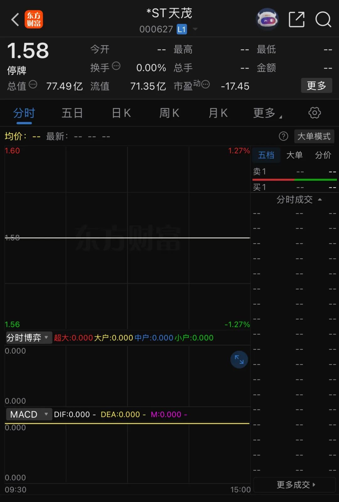 截至8月14日,*ST天茂股價報1.58元/股,總市值77.49億元。