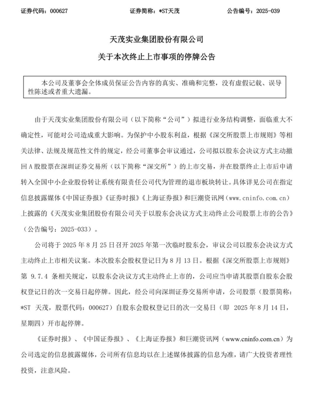 8月13日晚間,*ST天茂(000627)發(fā)布公告稱,公司擬以股東會決議方式主動撤回A股股票在深交所的上市交易,并在股票終止上市后申請轉(zhuǎn)入全國中小企業(yè)股份轉(zhuǎn)讓系統(tǒng)有限責任公司代為管理的退市板塊轉(zhuǎn)讓。