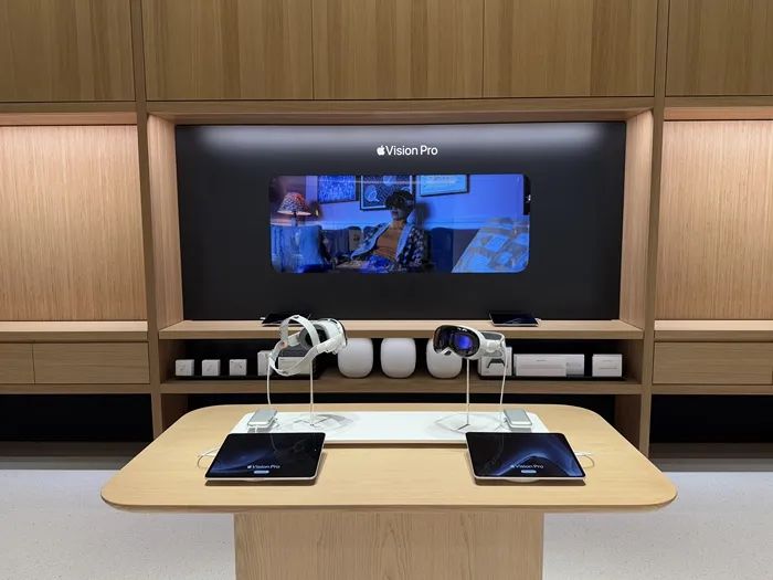 從感受上來說,這家店并非蘋果在大中華區(qū)設(shè)計和面積最突出的門店。除了標(biāo)配的Pick up取貨臺、Genius Bar天才吧,店內(nèi)布局較為緊湊,共有11張產(chǎn)品展示桌,其中4張用于展示iPhone,iPad和MacBook各有2張,其余用于展示iMac、Apple Watch等,還有一處Apple Vision Pro的專屬空間。