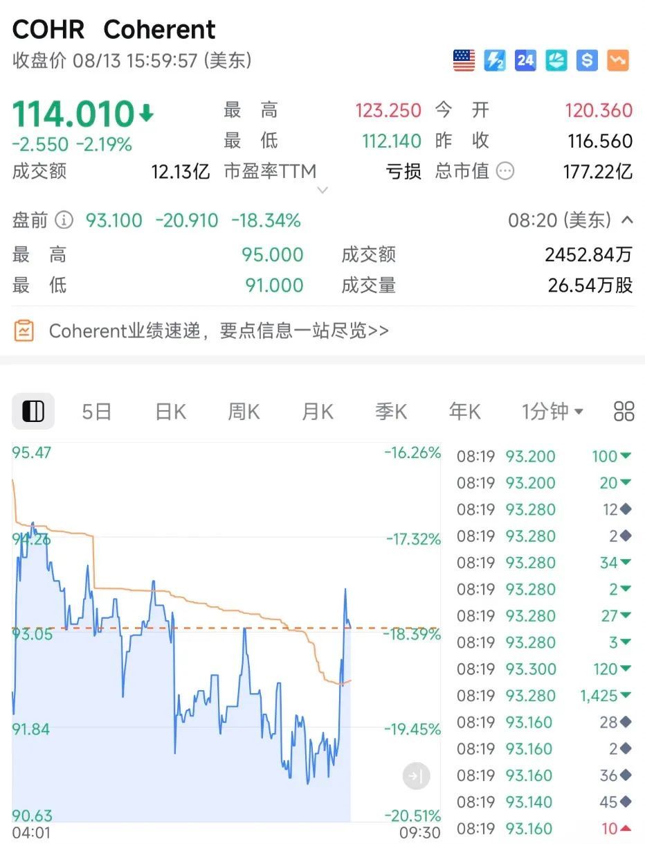 8月14日,美股盤前,美國光模塊巨頭Coherent股價大幅跳水,一度暴跌超20%,截至發(fā)稿,跌幅仍達18.34%。截至13日收盤,Coherent總市值報177.22億美元(約合人民幣1300億元)。