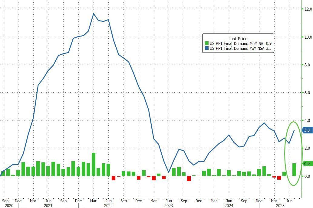 美國7月PPI同比漲幅從前月的2.3%飆升至3.3%,為今年2月以來最高水平,并且遠(yuǎn)超預(yù)期的2.5%,美國7月PPI環(huán)比0.9%,為2022年6月以來最大漲幅,預(yù)期0.2%,前值 0%。