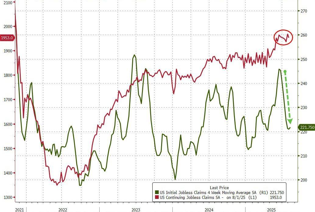 截至8月2日當周,持續(xù)申領(lǐng)失業(yè)救濟人數(shù)降至195.3萬人,低于預期的196.7萬人和前值197.4萬人。分析認為,續(xù)請失業(yè)金人數(shù)在過去幾個月持續(xù)徘徊于2021年以來的高位,這意味著失業(yè)者重新找到工作存在較大困難。