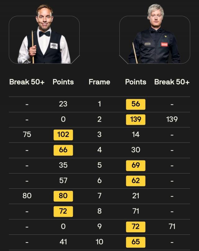 第七局,卡特單桿80分,80:21拿下,3 - 4落后。第八局,羅伯遜拿到71分,卡特卻以72:71單局絕殺,4 - 4戰(zhàn)平。第九局,羅伯遜單桿71分,72:0拿下,5 - 4領(lǐng)先拿到賽點(diǎn)。第十局,羅伯遜以65:41獲勝,6 - 4擊敗卡特進(jìn)入四強(qiáng)。