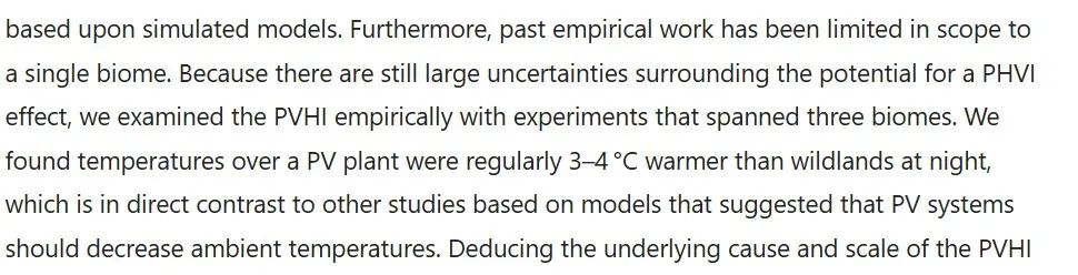 2016年發(fā)表于Nature的研究發(fā)現(xiàn),太陽(yáng)能發(fā)電站會(huì)形成小型“熱島”:亞利桑那州沙漠中的太陽(yáng)能發(fā)電站使夜間氣溫升高3至4攝氏度,且熱島效應(yīng)在幾百英尺/米范圍內(nèi)逐漸減弱。