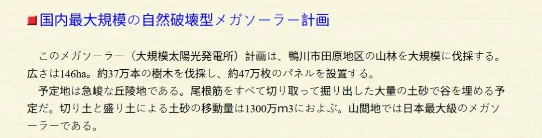 一些大型太陽(yáng)能項(xiàng)目建設(shè)要砍伐數(shù)十萬(wàn)棵樹(shù),引發(fā)日本居民強(qiáng)烈不滿。2024年,日本鴨川市居民反對(duì)太陽(yáng)能項(xiàng)目,該項(xiàng)目將砍伐鴨川市田原地區(qū)約37萬(wàn)棵樹(shù),占地146公頃,安裝約47萬(wàn)塊太陽(yáng)能電池板。這種砍伐森林建發(fā)電站的情況并非個(gè)例。