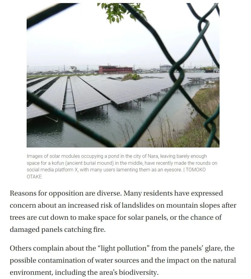 2024年5月,日本英文媒體《日本時(shí)報(bào)》報(bào)道,太陽(yáng)能項(xiàng)目遭反對(duì)的理由多樣。很多居民擔(dān)心,砍伐樹(shù)木安裝太陽(yáng)能電池板會(huì)增加山體滑坡風(fēng)險(xiǎn),受損電池板可能引發(fā)火災(zāi)。還有人抱怨電池板眩光造成“光污染”、可能污染水源以及影響自然環(huán)境(包括生物多樣性)。
