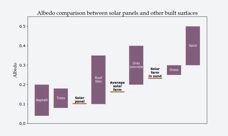 一方面,建造太陽(yáng)能電池板會(huì)降低土地反照率(反射光的比例),降低程度取決于土地類型。沙漠上建的太陽(yáng)能電池板比草地或?yàn)r青路面上建的更能降低反照率。降低反照率會(huì)使當(dāng)?shù)睾腿蜃兣?,但太?yáng)能電池板可通過(guò)其他方式彌補(bǔ)。