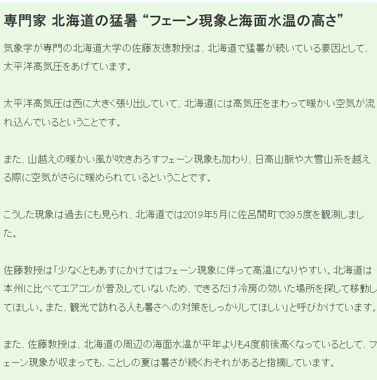 據(jù)NHK報(bào)道,標(biāo)題為“帶廣:預(yù)計(jì)(7月)24日最高氣溫達(dá)40攝氏度,有中暑生命危險(xiǎn),嚴(yán)格警惕”。文中北海道大學(xué)氣象學(xué)家佐藤友則教授表示,太平洋高壓是北海道持續(xù)高溫的因素之一。太平洋高壓顯著西移,使暖空氣流入北海道。焚風(fēng)穿過(guò)日高山脈和大雪山脈時(shí)進(jìn)一步升溫。