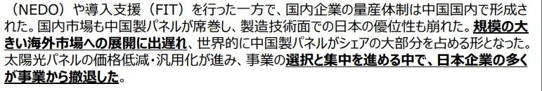 日本經(jīng)濟(jì)產(chǎn)業(yè)省2024年11月發(fā)布的《次時(shí)代型太陽(yáng)能電池戰(zhàn)略》指出,國(guó)內(nèi)市場(chǎng)上,中國(guó)制造的太陽(yáng)能面板占主導(dǎo),日本制造技術(shù)優(yōu)勢(shì)被打破。拓展海外大市場(chǎng)滯后,中國(guó)制造面板占全球大部分市場(chǎng)份額。隨著太陽(yáng)能電池板降價(jià)、通用化,企業(yè)選擇和集中過(guò)程中,許多日本企業(yè)退出市場(chǎng)。