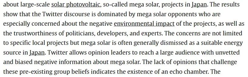 對(duì)于太陽(yáng)能發(fā)電板安裝,日本網(wǎng)民早有不滿。2023年4月,愛(ài)思唯爾出版社旗下《能源政策》月刊文章《日本的大型太陽(yáng)能(mega solar)推特討論:積極反對(duì)者與沉默支持者》,分析超5萬(wàn)條推文,了解人們對(duì)日本大型太陽(yáng)能光伏項(xiàng)目(兆瓦級(jí)太陽(yáng)能項(xiàng)目,發(fā)電量至少1兆瓦,夠約300戶家庭用一年)的態(tài)度、地域性和擔(dān)憂。