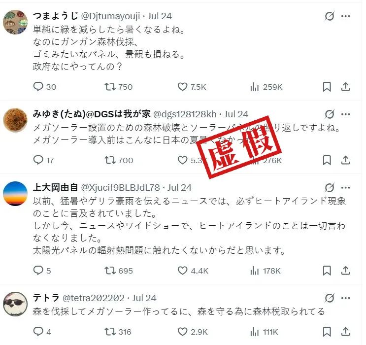 近期,海外社交平臺(tái)有說(shuō)法稱,“日本北海道高溫異常天氣受中國(guó)太陽(yáng)能發(fā)電影響”。該貼引發(fā)討論,部分內(nèi)容認(rèn)為“日本引進(jìn)中國(guó)產(chǎn)太陽(yáng)能發(fā)電板,砍伐樹(shù)木,加劇環(huán)境破壞”。還有賬號(hào)將該貼解讀為“中國(guó)的太陽(yáng)能發(fā)電站反射陽(yáng)光烘烤引發(fā)日本高溫”。