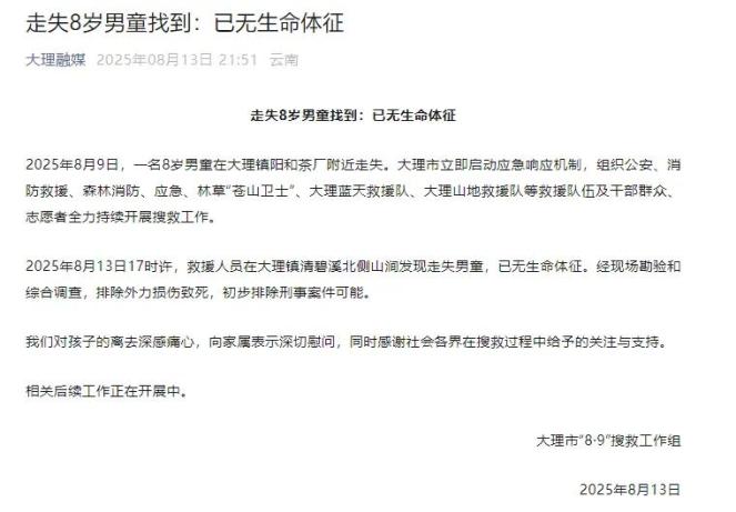 原標(biāo)題:《痛心!大理蒼山走失8歲男童遇難》