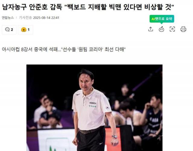 韓國男籃主教練安俊浩十分有意思,賽前他信心滿滿、牛氣沖天,聲稱1/4決賽定會越過中國長城。然而輸了比賽后,他卻表現(xiàn)得很不服氣。