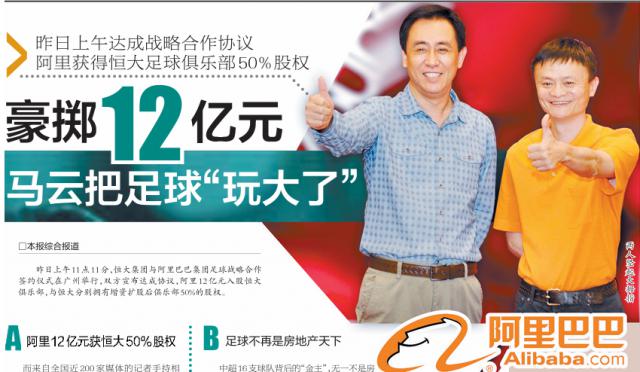 2014年,阿里巴巴出資12億元拿下廣州恒大足球俱樂部50%股權(quán),球隊(duì)更名為“廣州恒大淘寶”,并在新三板掛牌,成為“亞洲足球第一股”。馬云稱投資的是快樂與中國足球,雙方15分鐘就敲定了合作,球迷們熱情高漲。