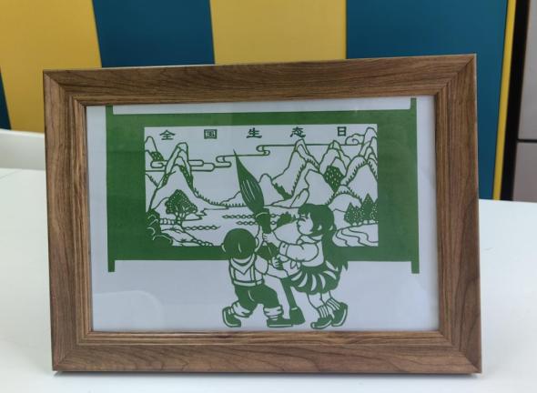 這幅由區(qū)級(jí)非遺代表性傳承人、楓林街道‘上海剪紙’傳承隊(duì)隊(duì)員鮑立峰創(chuàng)作的‘全國(guó)生態(tài)日’主題剪紙,以清新綠色為筆、鏤空技藝為墨,生動(dòng)地詮釋了‘全國(guó)生態(tài)日’的內(nèi)涵。剪紙中,兩名孩童并肩而立,用巨筆將‘守護(hù)生態(tài)’的信念融入山水長(zhǎng)卷,以層巒疊翠的山林、蜿蜒靈動(dòng)的溪流、錯(cuò)落生長(zhǎng)的草木,描繪出一幅‘綠水青山’的美麗畫卷。
