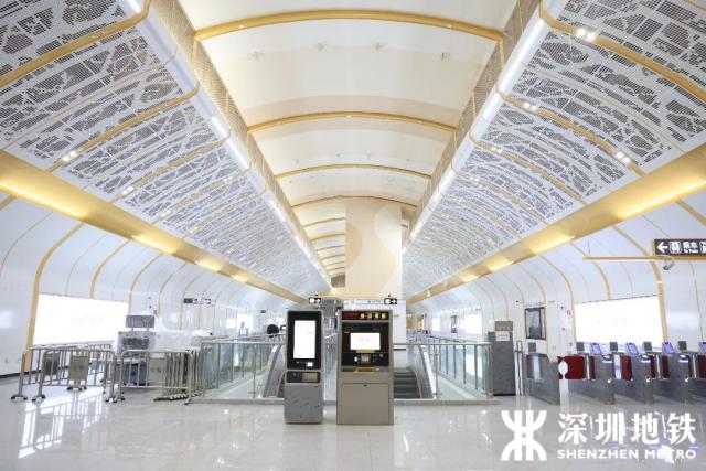 光明城站站廳層空間開(kāi)闊,裝修方案注重高品質(zhì)打造開(kāi)闊空間,還運(yùn)用頂部裝飾手法,形成不對(duì)稱鴛鴦設(shè)計(jì),能為乘客換乘指引方向。