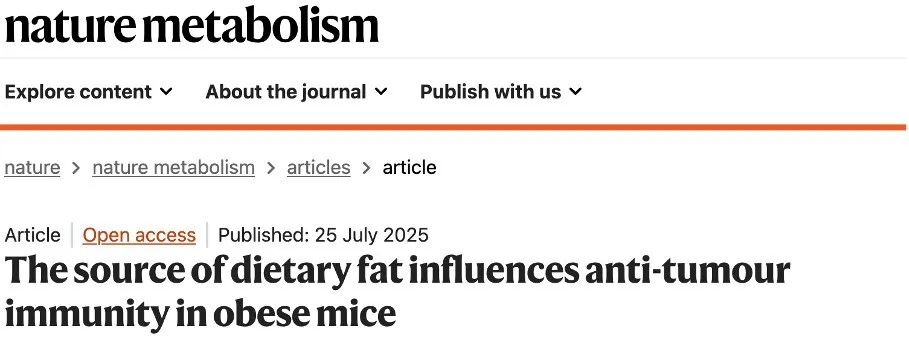 ①Kunkemoeller B, Prendeville H, McIntyre C, et al. The source of dietary fat influences anti - tumour immunity in obese mice. Nat Metab. Published online July 25, 2025. doi:10.1038/s42255 - 025 - 01330 - w