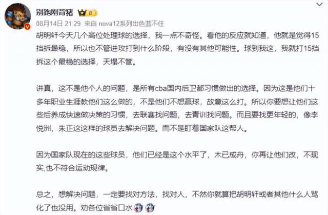 “別跑剛被豬”認為:胡明軒的幾個高位處理球是CBA國內(nèi)后衛(wèi)的習慣選擇,這是他們10多年職業(yè)生涯養(yǎng)成的,并非他們不想贏球故意這樣打。