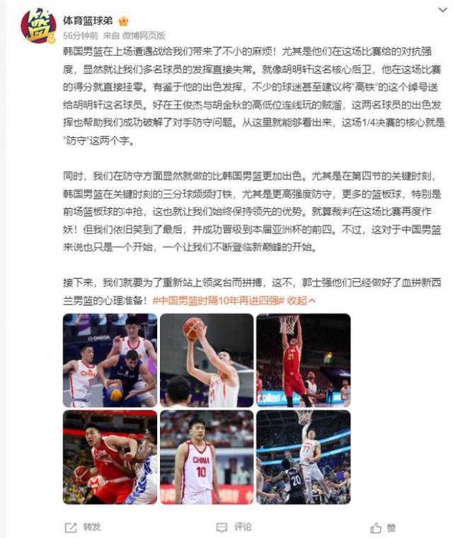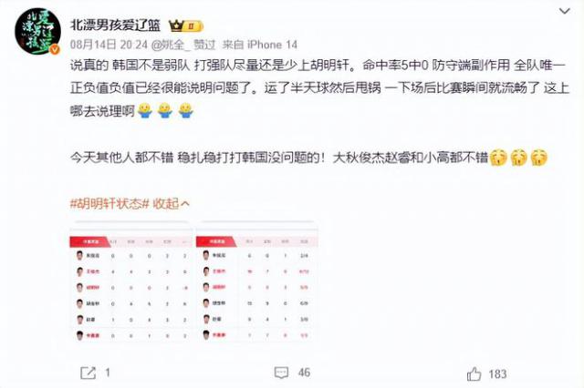 有博主指出:講真的韓國不是弱隊,打這樣的強隊胡明軒就盡量少用,進攻打鐵防守端副作用,全隊唯一正負值為負數(shù)已經(jīng)說明問題了。他一頓亂運后甩鍋,一下場比賽就流暢了。