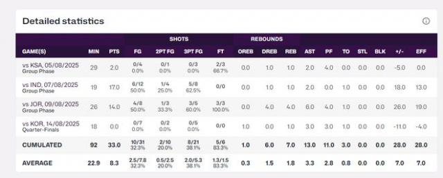 胡明軒這場比賽的狀態(tài)登上了熱搜。他全場先發(fā)17分33秒,投籃7中0,三分5中0,僅拿到0分1籃板3助攻1失誤3犯規(guī),正負值 -11,效率值 -4,無疑是中國男籃發(fā)揮最差的球員。