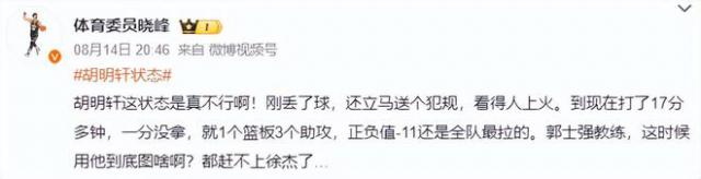 也有博主質(zhì)疑:胡明軒狀態(tài)真不行啊,郭士強用他是為了什么?這都快趕不上徐杰了。