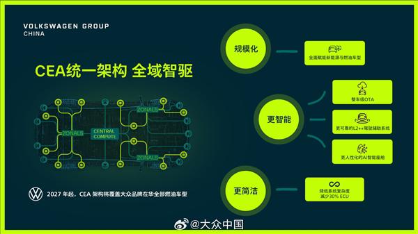 大眾中國(guó)官微發(fā)文稱:“2027年起,我們與小鵬汽車聯(lián)合開發(fā)的CEA架構(gòu)將拓展應(yīng)用到大眾品牌在華生產(chǎn)的燃油及混合動(dòng)力車型?!?/p>