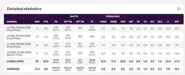 末節(jié),余嘉豪僅僅出戰(zhàn)11秒就被換下場(chǎng),因?yàn)轫n國(guó)的河允基5犯離場(chǎng),場(chǎng)上基本是小陣容,余嘉豪跟不上攻防速率。全場(chǎng)比賽,余嘉豪11分鐘,投籃3中1,罰球6中5,拿到7分7籃板1搶斷1蓋帽。
