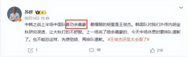 蘇群老師直言,中韓之戰(zhàn)上半場(chǎng)首功當(dāng)屬余嘉豪。