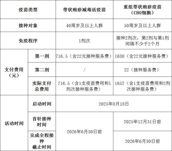 (3)重組帶狀皰疹疫苗(CHO細(xì)胞):2025年8月18日至2025年12月31日接種第1劑次,且2026年6月30日前完成全程免疫程序的適齡人群,可享受減免優(yōu)惠。未在規(guī)定時(shí)間完成全程接種的人員,不享受優(yōu)惠。