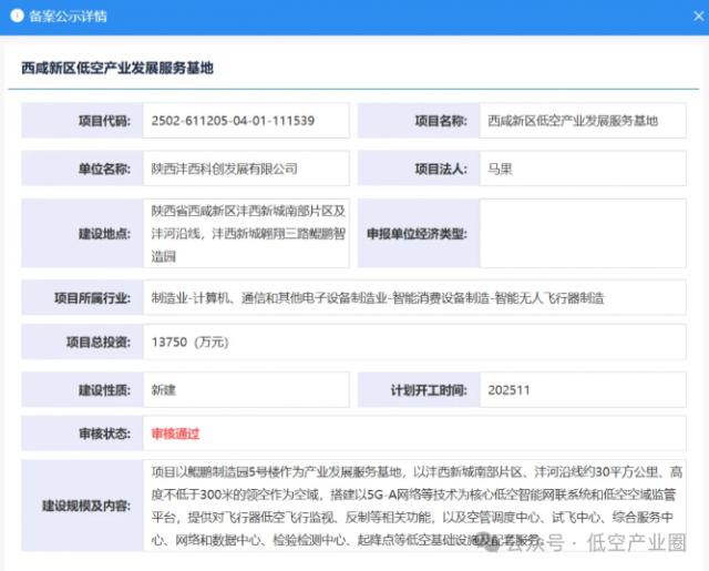 據(jù)悉,陜西灃西科創(chuàng)發(fā)展有限公司在今年2月份成功備案了西咸新區(qū)低空產(chǎn)業(yè)發(fā)展服務(wù)基地項目。項目總投資13750萬元,計劃2025年11月開工。