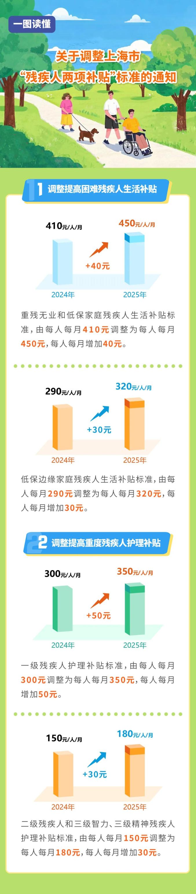 市民政局表示,為進一步強化民生保障,經(jīng)市政府批準,本市對殘疾人兩項補貼標準作出調整。具體調整內(nèi)容如下:1. 困難殘疾人生活補貼方面,重殘無業(yè)和低保家庭殘疾人的生活補貼標準,從每人每月 410 元提高至 450 元;低保邊緣家庭殘疾人生活補貼標準,由每人每月 290 元提升到 320 元。2. 重度殘疾人護理補貼方面,一級殘疾人護理補貼標準,從每人每月 300 元調整為 350 元;二級殘疾人和三級智力、三級精神殘疾人護理補貼標準,由每人每月 150 元提高到 180 元。新的殘疾人兩項補貼標準自 2025 年 7 月 1 日起正式施行。詳見↓