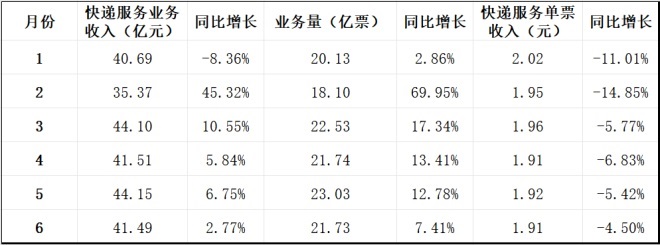 業(yè)務(wù)量同比增幅從2月的近70%降到6月的7.41%,業(yè)務(wù)收入增幅從2月的45.32%縮至6月的不足3%,單票收入連續(xù)六個(gè)月同比下滑。