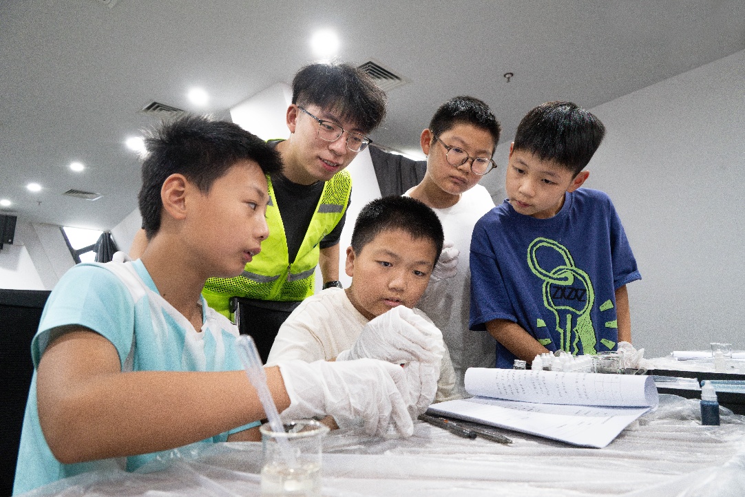 “我們家門(mén)口的小河和洪澤湖是連著的嗎?湖里的水可以直接飲用嗎?”在泗洪縣半城鎮(zhèn)祖姚社區(qū),孩子們圍著大學(xué)生問(wèn)個(gè)不停?!熬G澤青苗”行動(dòng)并未局限于縣城課堂,而是通過(guò)公益科普的形式,將影響力拓展到更廣闊的鄉(xiāng)村。在這里,科學(xué)營(yíng)活動(dòng)還有一個(gè)同步進(jìn)行的“分會(huì)場(chǎng)”,團(tuán)隊(duì)成員為15名農(nóng)村留守兒童送科普上門(mén)。