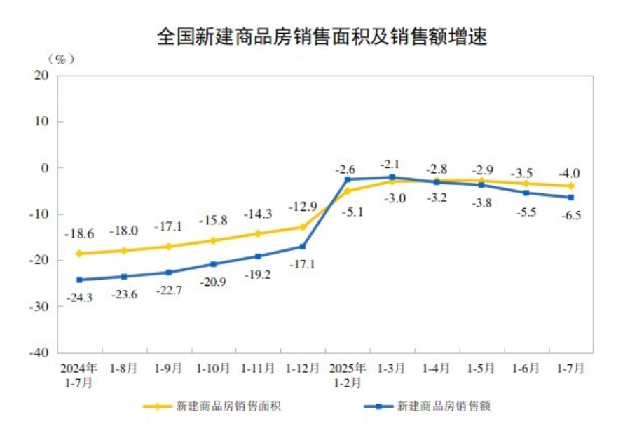 在市場(chǎng)需求方面,1 - 7月份,新建商品房銷售面積51560萬平方米,同比下降4.0%;其中住宅銷售面積下降4.1%。新建商品房銷售額49566億元,下降6.5%;其中住宅銷售額下降6.2%。
