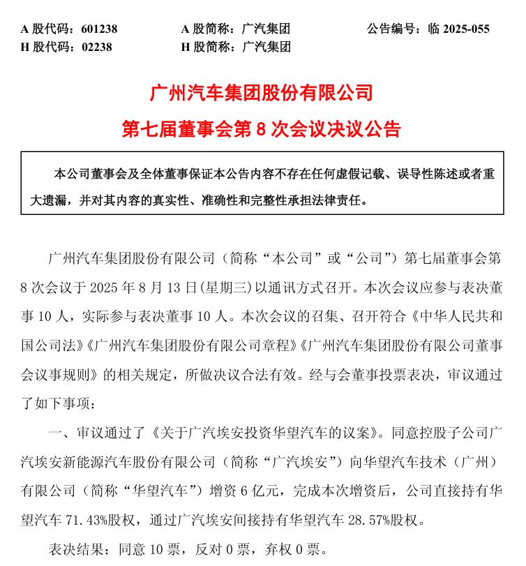 日前,廣汽集團(tuán)發(fā)布公告,董事會會議審議通過了《關(guān)于廣汽埃安投資華望汽車的議案》,同意廣汽埃安向華望增資6億元。完成增資后,廣汽埃安擁有華望汽車71.43%的股權(quán),廣汽集團(tuán)間接擁有華望汽車28.57%的股權(quán)。